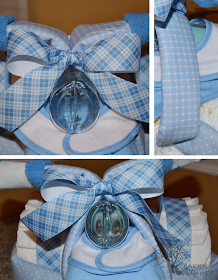 With the green light to proceed, I went shopping. I picked up a pack of size 1 diapers, 2 blue receiving blankets, a pair of blue baby socks, 2 blue bibs, a bottle and some ribbon.