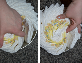 I saw some pictures online showing people using a cake pan to form rounds of diapers. So I tried that and it worked great! I used a regular 8 inch pan and 20 diapers to make each tire. I added one at a time, overlapping about an inch.